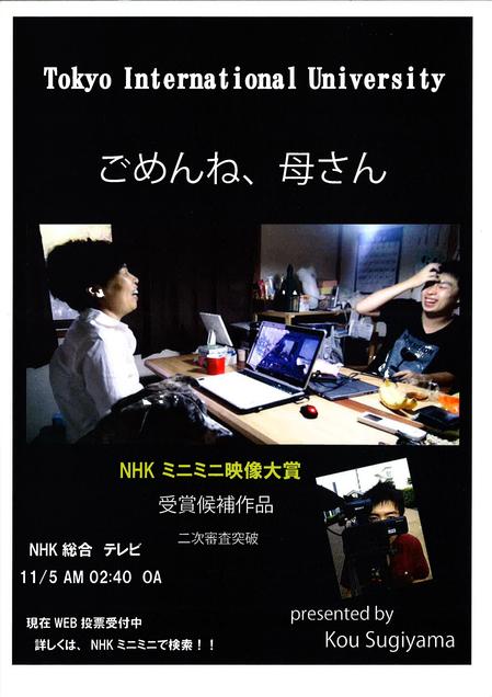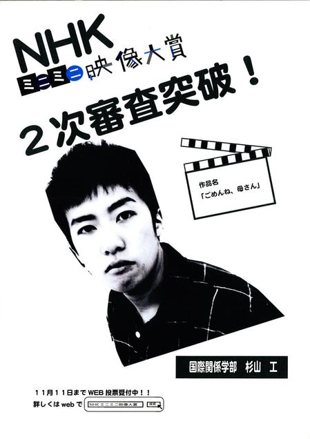 30秒の映像作品で競う「NHKミニミニ映像大賞」に国際関係学部国際メディア学科4年の杉山工さんが応募し、第1次審査・第2次審査を通過しました。
