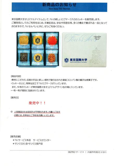 東京国際大学オリジナルアイテムとして、TIUの新しいロゴマーク入りのクッキーが出来ました。TIUせんべいと共に、ご贈答品・学会や同窓会等で是非ご利用下さい。