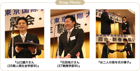 昨年から新春の集いで執り行っている藍旗賞授与式。山口雄介さん(35期人間社会学部卒)、 石田祐介さん(37期商学部卒)が受賞しました。
