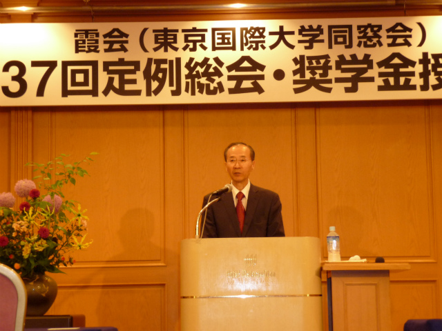 続いて行われた資格審査では、同窓会会則第29条「総会は正会員の100分の1以上を定足数とする。但し書面によって委任のあった場合は、出席とみなす」に準じ、正会員数44,915名に対し総会出席者および委任状は合わせて577名であり定足数449名を満たし、総会は成立したことが報告されました。