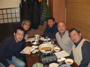 2012年12月8日(土)夜、仙台市の歓楽街・国分町のとある料亭にて、支部の忘年会を執り行いました。残念ながらスケジュールの重なりが有って、いつもより少ない参加数でした。しかしながら、東北の銘酒(浦霞・勝山・一の蔵・十四代・田酒ほか)を次から次へと呑み比べをし、いつもより速いペースで酔って行きました。埼玉県支部より転入された高橋伸章君(卒業して2~3年、?期)を迎え入れ、大学の進化状況を聞きだしては、「俺らの頃とは違うなぁ」の連発です。