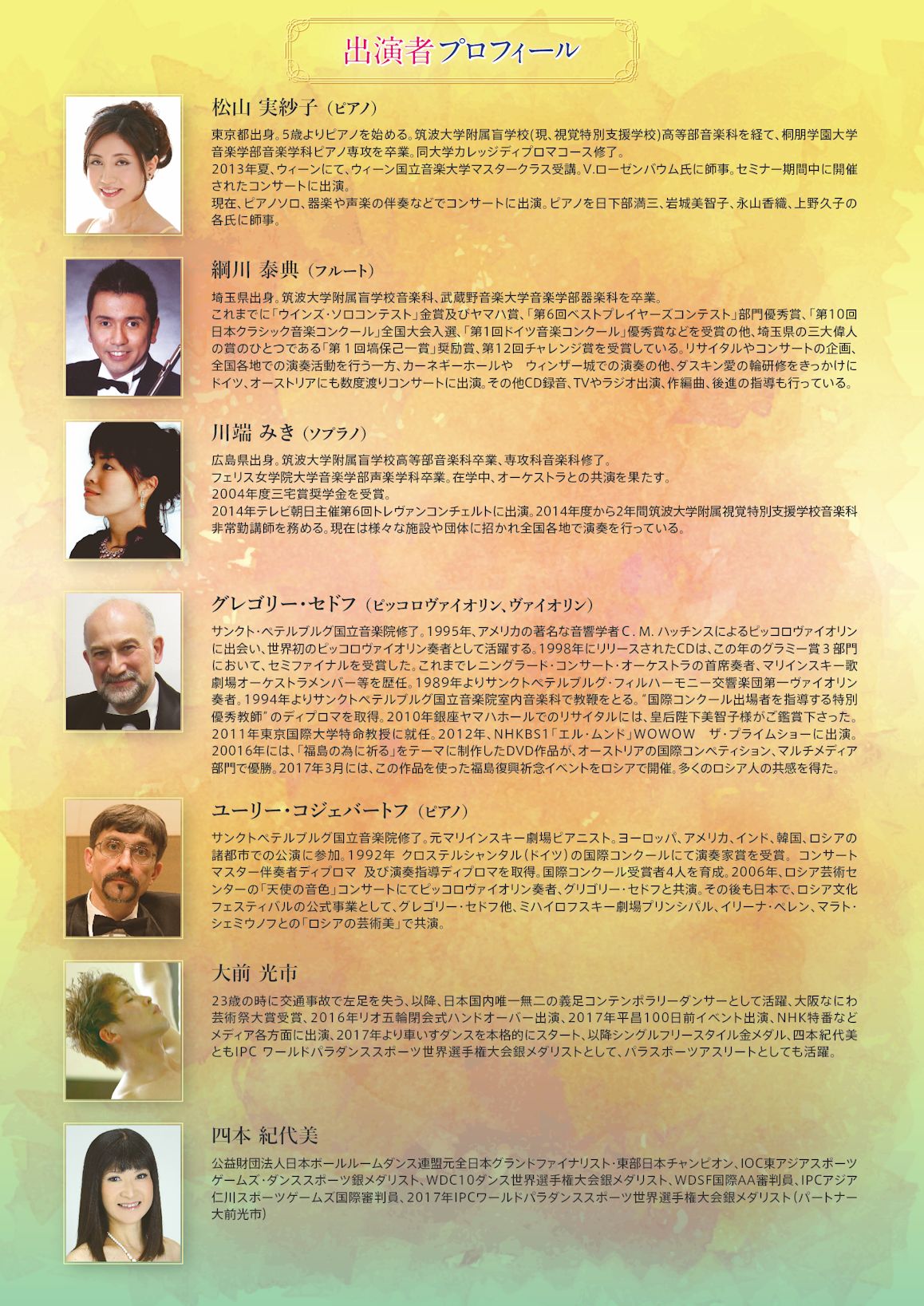 筑波大学附属視覚支援学校音楽科の卒業生で、海外でも演奏活動をして活躍している、若手3名を中心に、グレゴリーセドフとユーリーコジェバートフが共演する日ロ交流コンサートです。