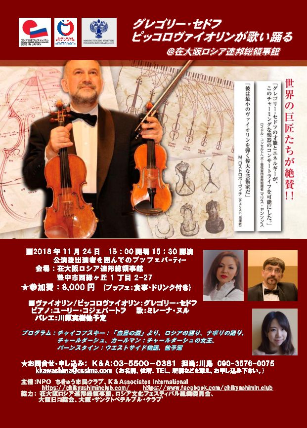 東京国際大学特命教授のグレゴリー・セドフ氏によるピッコロ・ヴァイオリンのコンサートが、下記のとおり東京と大阪で開催されます。