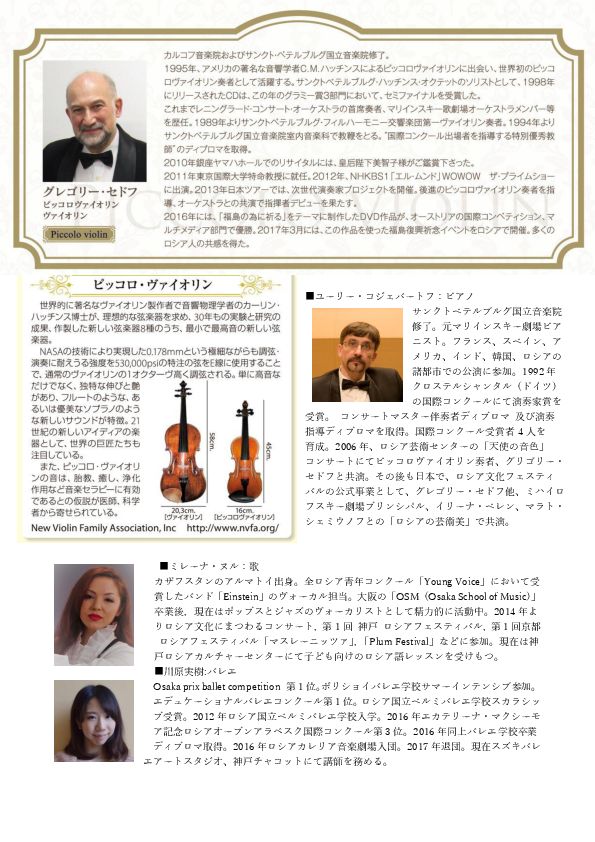 グレゴリーセドフは、2011年東北の震災後も、福島で演奏し、避難所へも慰問に行き、その後も継続して、ロシアと福島で